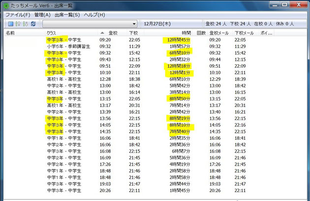 こちらは、昨日の冬期講習の出席状況です。(名前は消してあります)